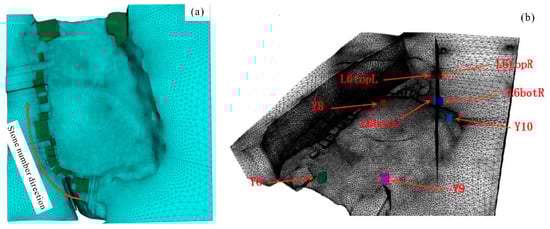 The parameters of rock mechanics required for the numerical simulation were obtained after the aforementioned evolutionary law and geomechanical qualitative analysis (Table 3). The boundary conditions of the rock body of the roof slab of Yuanjue Cave are very clear, and this chapter analyzes them from the perspective of 3D modeling and numerical simulation for a precise quantitative perspective [46]. Combined with the aforementioned stratigraphic distribution characteristics and physical and mechanical parameters of the rock body [47,48], the final stability study was conducted by finite difference software for the effect of overhanging, crushing, and damage of the roof slab on the overall top slab of Yuanjue Cave, respectively. In the aforementioned study, it is given that the top plate of the Yuanjue Cave has formed a relatively independent block structure in the form of a “triangular thick plate” (Figure 3), in which the J10 fissure forms a natural cutting boundary on the east side, so the model boundary on the east side can be extended 5 m eastward as the boundary of the J10 fissure. The rock body of the top slab on the west side forms a fracture boundary along the L6 fissure, but this boundary intersects the axis of the cave chamber horizontally at a large angle to accommodate the space of the cave chamber, so the west side extends westward to the end of the cliff wall of the L6 fissure with the west boundary of the cave chamber. The northern boundary is the hollow surface of the cliff wall, and the entrance of the cave canal can be used as the boundary; the southern side is bounded by the convergence angle of the roof slab. The rock supporting the top slab is the image formation, which is relatively stable and intact, so it can be extended below the top slab to the bottom part of Yuanjue Cave, and the three-dimensional model is shown in Figure 9. The model of the top slab of the Yuanjue Cave was established with 109,524 units and 19,856 nodes.