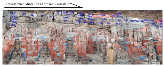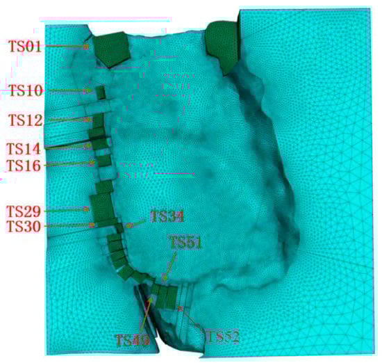 Through the preliminary cave investigation, it was found that the single blocks of cracked boulders included TS01, TS02, TS03, TS04, TS07, TS08, TS10, TS11, TS12, TS14, TS17, TS31, TS32, TS36, TS52, and TS53. According to the contact area and grouping of the boulders, the groups where the cracked boulders are located were TS01, TS10, TS12, TS14, TS16, TS29, TS30, TS34, TS49, TS51, TS52, as shown in Figure 16. The cracked and damaged boulders were mainly distributed in the middle and front parts of the boulder-filled area.