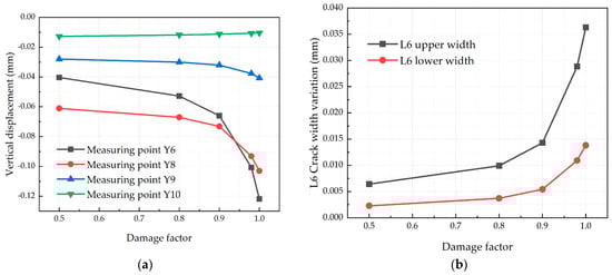 (a) Variation curve of the vertical displacement of each measurement point with the damage factor of cracked slates; (b) variation curve of the increase of the L6 crack width with the damage factor of cracked slates.