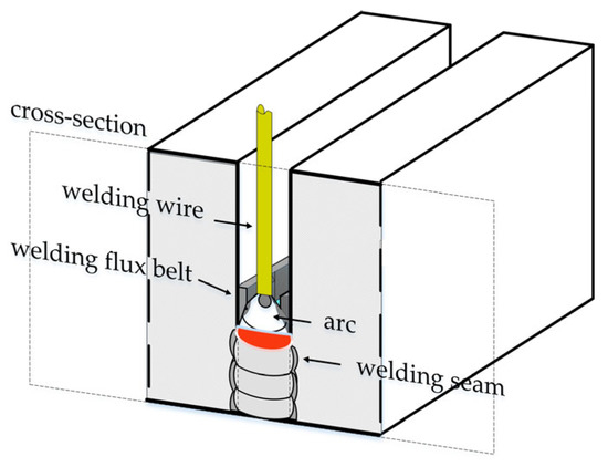 The ultra-narrow gap welding principle is shown in Figure 1. In a 4–6 mm wide “I” shaped straight groove, the flux sheet is used to restrain and regulate the arc to heat and melt both walls simultaneously and the bottom of the weld surface, resulting in a single-pass formation of each layer of the weld, with a smaller weld volume and lower linear energy than conventional arc welding, and good mechanical properties of the joint. The weld cross-sectional shape parameters are the key variables of the method for parameter optimization and quality online prediction studies.