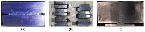 Description of the process of obtaining weld cross-section slices: (a) welding specimen; (b) specimens after slicing; (c) specimens after slicing and etching.