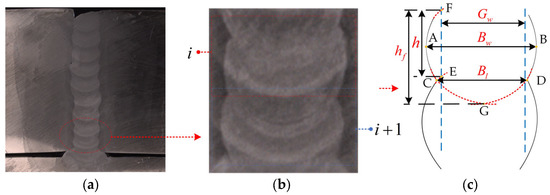 Illustration of weld image and geometric dimensions to be measured: (a) cross-sectional image of a welded specimen; (b) a “measurement unit” image; (c) geometric dimension diagram.