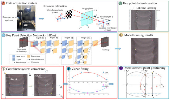 The measurement steps of the proposed method are shown in Figure 4. First, the weld shape is collected using the measurement system, and the camera is calibrated using the coplanar linear camera calibration method, as shown in step (A). Next, 18 feature points of the “measurement unit” are defined. A fusion line corresponds to five feature points to build the key point detection data set and train the key point detection network HRnet to realize the feature point localization of the “measurement unit,” as shown in steps (B), (C), and (D). Then, the coordinates of the key points are transformed to the weld coordinate system, and the five key points are fitted with the least squares method to obtain the geometric model of the fusion line, as shown in steps (E) and (F). Finally, the fitted curves are placed in the same coordinate system, and the coordinates of the key measurement points are derived using geometric relationships to obtain the dimensions of the shape parameters, as shown in step (G).