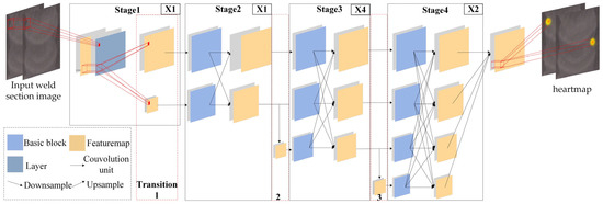 HRNet is a key point detection network for 2D human pose estimation based on the heatmap approach, which can better extract multi-resolution features of the input image and has a powerful feature representation capability [16,17,18]. The layout of the 18 key points of the “measurement unit” is centrosymmetric with the layout of the human body key points, which has excellent similarity; so, the HRNet network is used as the feature point detection network, and its network structure is shown in Figure 6.