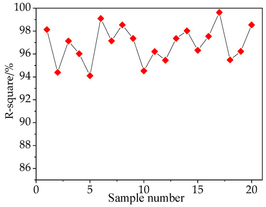 R-square is the coefficient of determination of the curve fit, which characterizes the quality of the quadratic polynomial fit, and the closer the value is to 1, the better the fit is. R-square is the curve fitting coefficient, which characterizes the quality of the quadratic polynomial fit, and the closer the value is to 1, the better the fit is. The fitting coefficients of the above four curves are all greater than 94%, which is a good fit. In addition, 20 groups of key point data were individually selected, their coefficients of determination in the least squares fitting were calculated, and R-square curves were plotted, as shown in Figure 8. The average R-square values of the fitted curves were all greater than 94%, indicating that the method can be used to fit the weld profile.