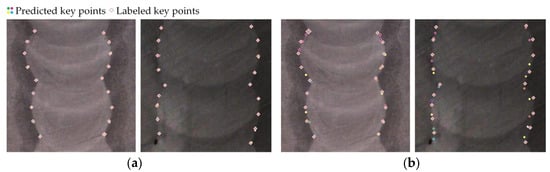 Key point detection visualization results: (a) the detection results of the model trained for 150 epochs; (b) the detection results of the model trained for 50 epochs.