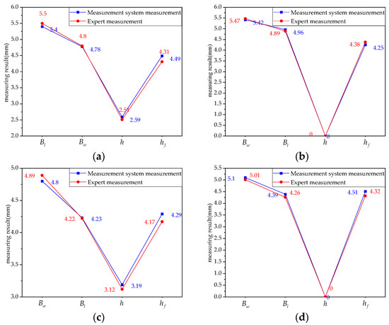 Two actual “measurement unit” with weld groove widths of 4.80 mm and 4.60 mm were selected, containing four weld seams (a), (b), (c), and (d), The four key dimensions , , , and were measured using both manual measurements by highly experienced experts and measurements by the measurement system, with the expert measurement distance defined as , the measurement system measurement distance defined as , the absolute error mean defined as , and the relative error means defined as . The obtained measurement results are shown in Figure 12 and Table 5.