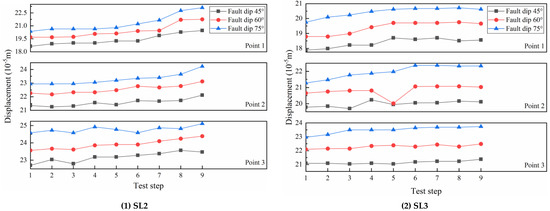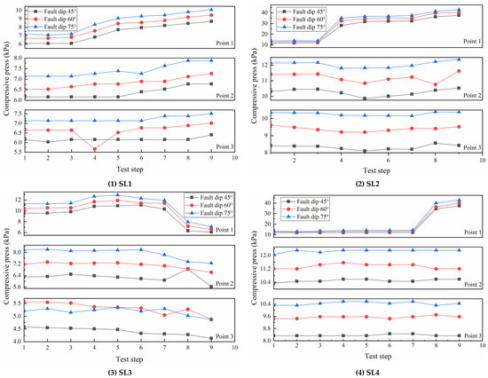 During the model tunnel excavation process, the surrounding rock pressure was measured at each step in the SL area, as shown in the line diagram presented in Figure 10. The tunnel was excavated using the CD method with three different fault dip angles: 45°, 60°, and 75°. Analysis of the collected data revealed that the surrounding rock pressure increased as the fault dip angle increased. Specifically, the surrounding rock pressure was highest for the 75° fault dip angle, followed by the 60° fault dip angle, and then the 45° fault dip angle.