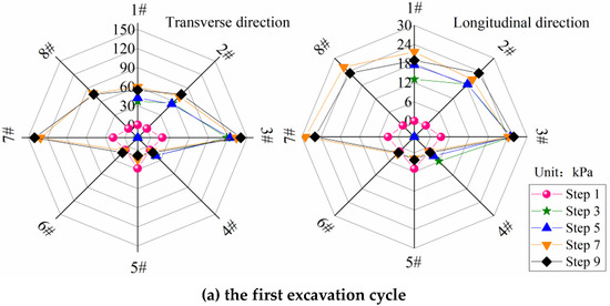 The measured lining structure stress in each step of the three cases of the CD method for model tunnel excavation is presented in Figure 12 and Figure 13. The results show that, in the second excavation cycle, the radial stress on each measuring point, including the vault, haunch, side wall, arc feet, and inverted arc, increases with an increase in fault dip. The stress at 60° and 75° dip inclination is 1.08 and 1.16 times higher, respectively, than that at 45°. In the longitudinal direction, the stress at the vault position at 60° and 75° dip degrees is 1.16 and 1.79 times higher, respectively, than that at 45°. The stress at the haunch position at 60° and 75° dip degrees is 1.17 and 1.25 times higher, respectively, than that at 45°. The stress at other positions at 60° and 75° dip degrees is 1.09 and 1.17–1.20 times higher, respectively, than the value at 45°. Furthermore, the stress value in the side wall position is higher than that in any other position after the mid-partition is mantled to form a closed-loop lining structure.