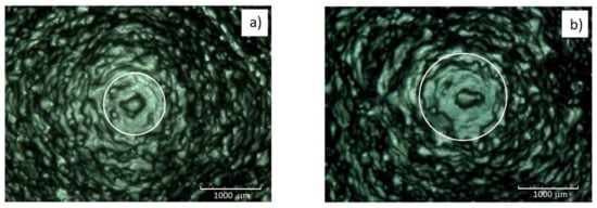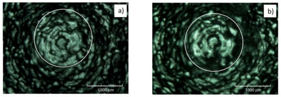 Conversely, after 525 min in a dry condition, the widening of the particle distribution concerning the tip before tests is not observed, but a reduction of the particle number inside the white circle can be noted (Figure 5). Due to the higher hardness compared to that of the polymer, the metallic pin does not undergo significant wear phenomena. The authors interpreted the dark zone on the pin as a lack of metallic particles due to the limited effect of wear (debris not appreciable with a weight scale accuracy of 0.1 mg). The reduction of the number of particles inside the white circle with respect to the pin before the test can be ascribed to the friction forces typical of dry conditions, which have values five times higher than those acting under lubrication [].
