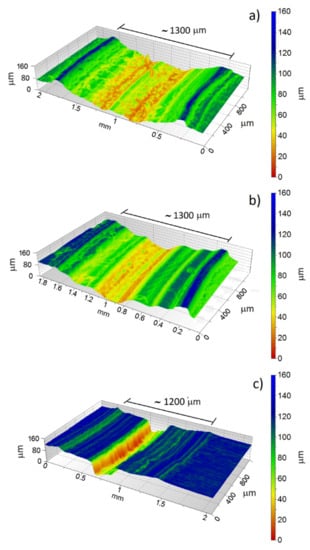 The lubricating film is fundamental for reducing the asperities interaction between the surfaces in contact and improving wear behavior. In fact, the 3D images obtained with the confocal microscope (Figure 6) revealed that, in dry conditions, the height of the pile-ups is higher than under lubrication. Moreover, in SSF, the wear track is narrower than in dry conditions. Finally, in the case of lubrication, the reduced presence of debris (Figure 7c) demonstrates a prevalence of adhesive mechanisms.