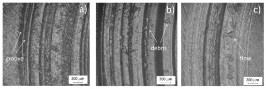 The results of optical observations on the polymeric surface after the pin-on-disc trials are shown in Figure 7. The first two micrographs are characterized by several annular grooves with debris mainly inside them, as single particles or in clusters. Moreover, in the case of (b), scratches are present, probably due to the metal debris acting as micro-cutting tools. In the last micrograph, the number of grooves is lower, and polymeric material flows are visible.