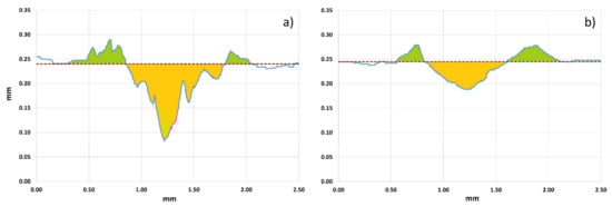 It can be assumed that the material that leaves the empty area (yellow area) of the groove below the reference dashed red line partly contributes to the formation of debris and partly to the lateral corrugations (green areas). Therefore, the volume of debris can be obtained by multiplying the difference between the yellow area (A(yellow)) and the green area (A(green)) by the length of the mean circumference (corresponding to the diameter indicated in Figure 8a).