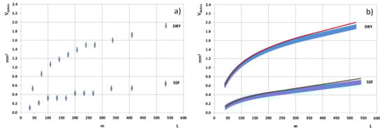 Debris volume vs. slight length in dry conditions and in SSF: (a) experimental points of Vdebris vs. L deduced from weight measurements [], (b) Comparison between curves deduced from weight measurements (blue ribbons) and curves obtained with volume measurements (red lines).