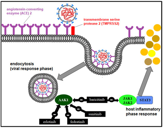 Baricitinib (Olumiant®) is a JAK inhibitor used in rheumatoid arthritis [50], which could inhibit endocytosis using a three-dimensional virtual model [51]. In addition, it participates in the immunomodulation of the inflammatory cascade [52,53].