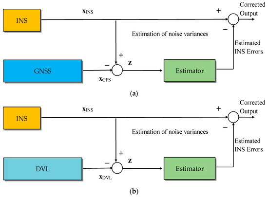 Example of integrated navigation systems: (a) GNSS/INS for air and land applications; (b) INS/DVL for underwater applications.