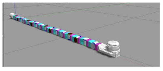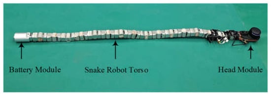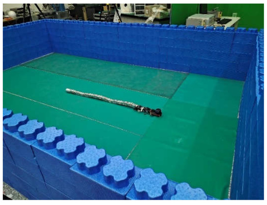 This experiment is carried out with a 16-DOF snake robot [21] with a head controller and a battery module. The ground uses rubber as the playground for the snake robot to increase static friction to ensure the operating efficiency of the snake robot. The experimental scene is shown in Figure 12.