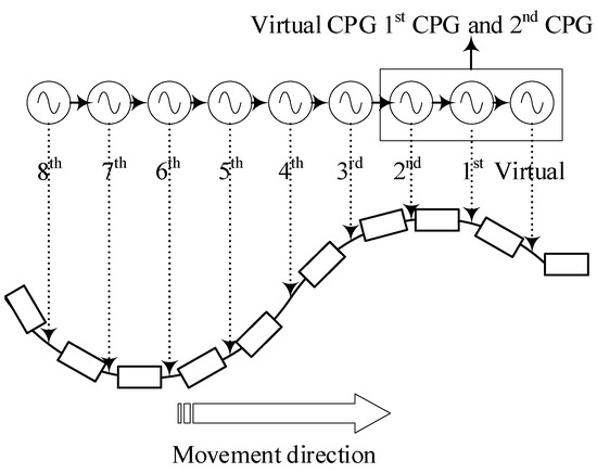 - Dao, Q.M.; Vo, Q.T. Design of a CPG-based close-loop direction control system for lateral undulation gait of snake-like robots. In Proceedings of the 2017 International Conference on Advanced Technologies for Communications (ATC), Quy Nhon, Vietnam, 18–20 October 2017; pp. 114–119. [Google Scholar]