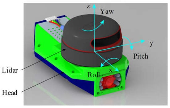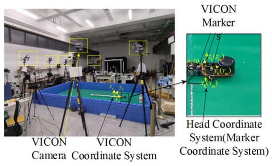 Among them, , and , respectively, represent the attitude rotation matrix of the head coordinate system relative to the VICON coordinate system, the marker coordinate system relative to the VICON coordinate system and the head coordinate system relative to the marker coordinate system. To simplify the calculation, the head coordinate system coincides with the marker point coordinate system during the experiment, as shown in Figure 13.