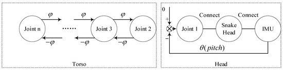 In this article, we made improvements to the CPG model in Figure 4, as shown in Figure 8. We divided the robot into two parts: the head and the torso. The head of the snake robot consisted of the head module and the first joint of the robot body; the torso of the snake robot consisted of the remaining 15 joints and the battery module. In the improved CPG model, the data obtained from the IMU for the head joint are used for feedback, which is controlled through the head controller.