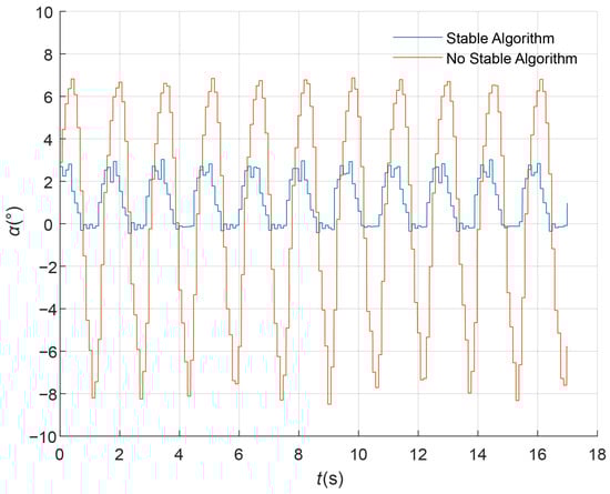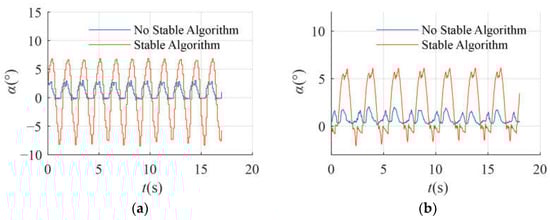 In Figure 17a, the Root Mean Square Error (RMSE) of the simulation without the stability algorithm is 5.10, and the RMSE of the simulation with the stability algorithm is 1.57; the RMSE between the simulations with and without the stable algorithm is 4.42. In Figure 17b, the RMSE of the experiment without the stability algorithm is 3.23, and the RMSE of the experiment with the stability algorithm is 0.94; the RMSE between the simulations with and without the stable algorithm is 2.68.