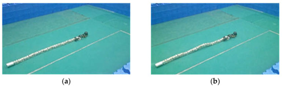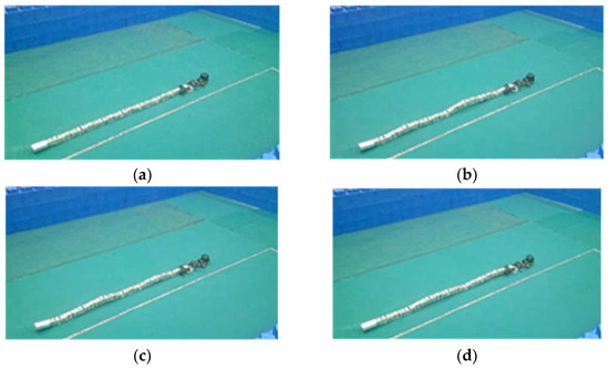 Based on the robot’s inchworm locomotion gait, experiments were carried out on the movement of the snake robot with and without the stabilization algorithm. The experimental procedure is shown in Figure 14 and Figure 15 and the experimental results are shown in Figure 16.