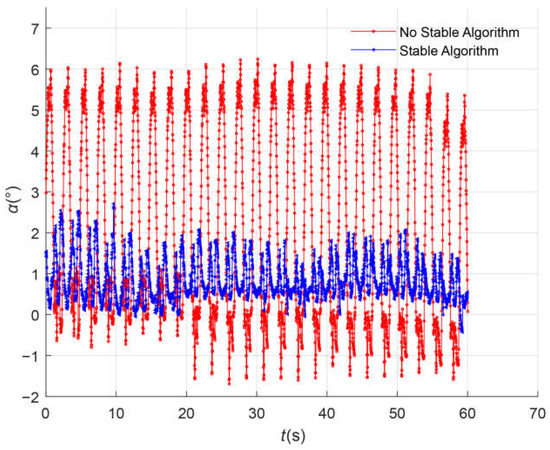 In Figure 11, α represents the vertical component of the head module of the snake robot, represents time, the red curve represents the vertical component of the head module without a stabilization algorithm and the blue curve represents the vertical direction of the head module when the stabilization algorithm is the added portion. It can be seen that the stabilization effect of the stabilization algorithm is relatively good.
