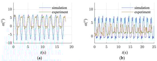 Comparison of simulation and experimental data. (a) Pitch angle of head module without stabilization algorithm; (b) pitch angle of head module with stabilization algorithm.