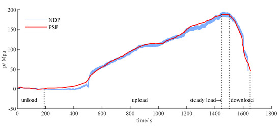 In order to verify the accuracy of the NDT, a strain gauge was attached near the pressure sensor installed at the stage of pipe fabrication. The reconstructed pressure based on the NDT (Section 3.2) and the pressure measured by a pressure sensor (PSP) were compared during the entire test run (Figure 6). The pressure change based on the NDT was in good agreement with the PSP, particularly during the steady load process, with the exception of the initial upload time. The deviation during the initial upload process can be explained by the strain gauge’s inability to distinguish the stress caused by the minute but sudden changes in the internal pressure. However, as the working pressure was increasing gradually and the stress fluctuation could be negligible, the deviation had very limited effects.