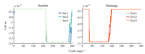 Figure 10 depicts the lift of the suction/discharge poppet valves. For the suction poppet valves, Inv1 (Figure 9), which is closest to the inlet, has a significantly larger gas force than Inv2 and Inv3. The gas force matched the spring force appropriately, and the opening and closing process took the least amount of time and remained fully open for the longest period of time with a good motion pattern; In3 (Figure 9), which is the farthest from the inlet, had the lowest gas force and obvious chattering after the valve sleeve was just opened, and it repeatedly hit the spring seat.