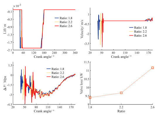 Figure 12 illustrates the lift (top-left) and velocity (top-right) of Exv2, as well as the pressure drop (bottom-left) and valve loss (bottom-right) of the central valve during the exhaust process at various pressure ratios. The greater the pressure ratio, the quicker the valve opens, and the faster the valve sleeve hits the spring seat, the shorter the valve’s lifespan. In addition, the overall trend of the pressure drop was unrelated to the pressure ratio, but roughly the same as the piston motion (Equation (2)) trend, which first increased and then decreased. Furthermore, the larger the pressure ratio, the greater the pressure drop in the valve opening’s early peak, and the greater the valve loss.
