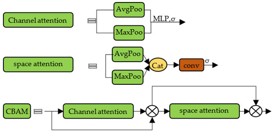 The attention graph is then multiplied by the input feature map to perform adaptive feature optimization. This module is a lightweight general-purpose module a with negligible module overhead, and is seamlessly integrated into the YOLOv5l network architecture in this paper to complete end-to-end training with the backbone network. The CBAM attention mechanism module is shown in Figure 2, where AvgPool denotes the average pooling operation, MaxPool denotes the maximum pooling operation, MLP denotes the multilayer perceptron, and σ is the sigmoid function.
