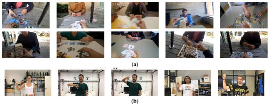 The EgoHands dataset consisted of 48 videos, each recording a complex first-person interaction between two test subjects using Google Glass in different environments, such as playing cards, blocks, and chess. The TinyHGR dataset captured data from 40 people making 7 gestures, 20 of which were filmed against simple backgrounds and 20 against complex HCI backgrounds (highly cluttered backgrounds with large illumination variations, see Figure 4). Approximately 1400 frames of each gesture were taken consecutively per person, with sizes of 1920 × 1080, and the gestures appeared at different locations in the images. The largest proportion of each image in this dataset included the face and body, with the gestures only accounting for about 10% of the overall image size. For this paper, 1000 of these complex background gesture images were selected, and the gesture positions were labeled using Labelimg. Figure 4 shows the sample images from the two datasets.