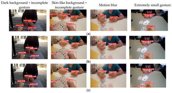Figure 5 shows a visualization of the different algorithms’ detection processes using the Egohands dataset. Comparing column 1, where the backgrounds are darker and there are incomplete gestures present, all gestures were correctly identified by the comparison algorithms. However, the YOLOv7 algorithm’s recognition accuracy dropped to 80% for the incomplete gesture in the bottom right corner, and the identification of the rest of the gestures was also less accurate than with other comparison methods. In column 2, where the pictures have skin-like backgrounds and incomplete gestures, the YOLOv7 algorithm missed a detection. In column 3, we can see that the left gestures are blurred by motion. Despite this, all of the comparison methods accurately recognized the blurred gesture, except for the YOLOv7 algorithm, which had a slightly lower recognition accuracy. This extreme case was not recognized by any of the other comparison methods.