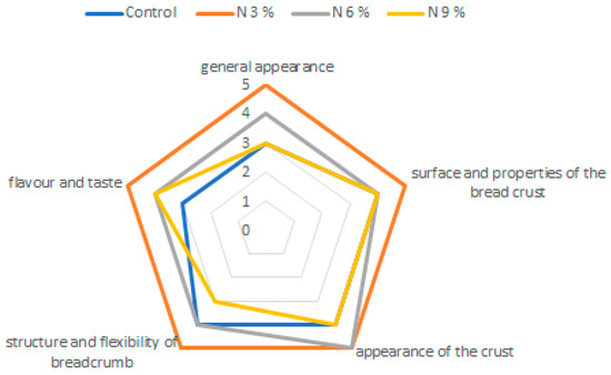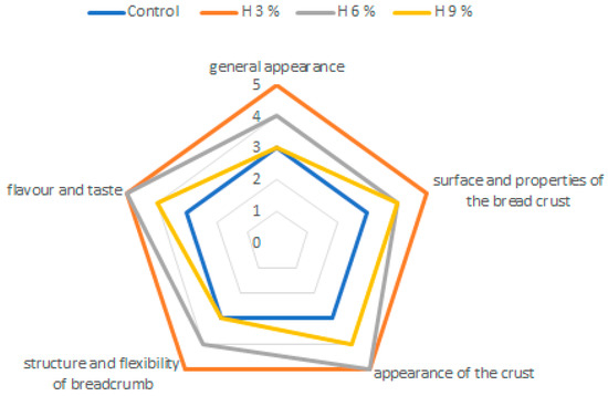 The sensorial properties were tested by a panel of 30 trained panellists (in age 22 to 65; 15 women and 15 men). The breads were evaluated 12 h after baking. Panellists were asked to evaluate general appearance, surface, and properties of the bread crust, appearance of the crust, structure, and flexibility of breadcrumb, flavour, and taste. Ratings were made on a 5-point hedonic scale, where 5 means “I like very much” and 1 means “I dislike very much”.
