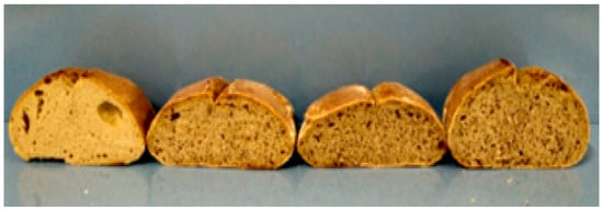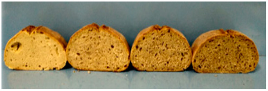 The experimental baking was performed under laboratory conditions. Control bread was prepared using 100% wheat flour T 650, sourdough 4%, salt 1.8%, and water (by water absorption according to the farinograph results—water absorption 59.8%). The enriched bread was prepared the same way but with addition of 3, 6, and 9% of Norik wholemeal flour and with the addition of 3, 6, and 9% of Hucul wholemeal flour. All dough variants were mixed separately using a laboratory Diosna SP12 mixer (Osnabrück, Germany), using parameters described previously [13], placed in baking forms, and let to rise in an electronically controlled stage oven with a fermentation station (Miwe Condo, Arnstein, Germany) for 4 h at 30 °C. Then, each sample was baked by steaming for 10 min at an initial temperature of 240 °C, then for 25 min at a temperature of 220 °C.