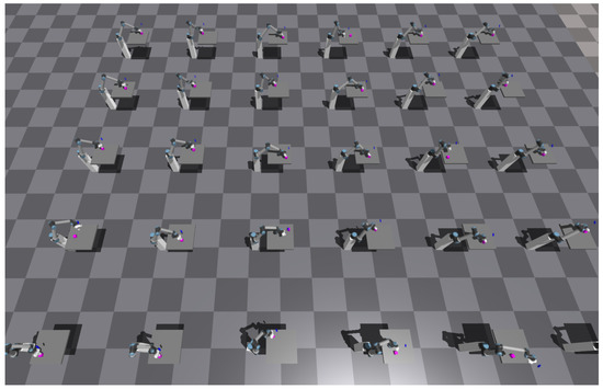 We carried out our experiment on a computer with a Nvidia RTX 2080Ti GPU (12 Gigabyte Memory), Intel i7-10700k CPU, and 64GB of RAM. We created 30 sub-environments in the simulation, as shown in Figure 4. Our code is available at here (https://github.com/rolandying/Monocular-based-pick-and-place, accessed on 29 March 2023). The implementation of some algorithms depends on the RL_games [25] package.