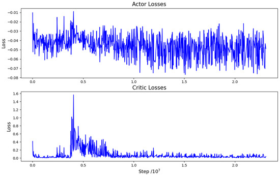 The losses incurred during training are depicted in Figure 6. Analysis of the figure indicates that the value of actor losses (AL) consistently oscillates within a confined range, signifying a stable policy change ratio. This underscores the efficacy of the clipping operation. The value of critic losses (CL) exhibits a continuous decline and ultimately stabilizes, except for a single abrupt change in the middle. At roughly 4 million steps, both AL and CL values experience a peak. This aligns precisely with the moment in Figure 5 when the robot makes a significant breakthrough and adeptly grasps the target around the 4000th epoch. At this point in time, both the value and policy undergo a rapid transformation.