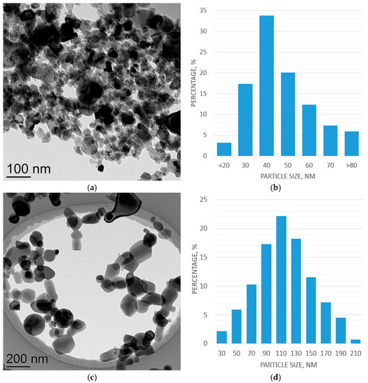 The TiO2 particle sizes were determined by a transmission electron microscope (TEM) examination. In the images for two types of nanoparticles (Figure 2a,c), subspherical particles and polyhedrons were observed (probably due to the presence of two TiO2 polymorphs). It can be seen that the nanoparticles with an average diameter of 46 nm are in a strongly aggregated state, in contrast to the larger ones. The distribution histograms plotted from the images (Figure 2b,d) show a fairly wide range of particle sizes, and their average diameter was 44 nm and 104 nm.