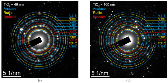SAED patterns of the as-synthesized TiO2 samples: dav = 46 nm (a), and dav = 100 nm (b). The following symbols are used: A—anatase, R—rutile, and B—brucite. The numbers in parentheses correspond to the hkl indices of the atomic planes.