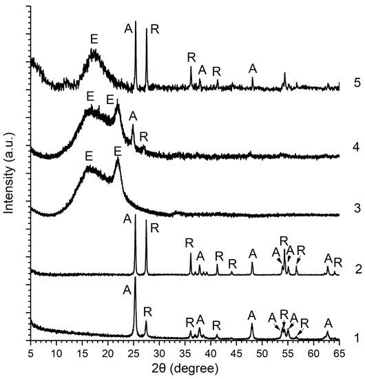 XRD patterns: 1—TiO2 (dav = 46 nm); 2—TiO2 (dav = 100 nm); 3—cured epoxy; 4—TiO2/EP of System I (4 wt. % TiO2); and 5—TiO2/EP of System II (4 wt. % TiO2). The following symbols are used: A—anatase, R—rutile, and E—cured epoxy resin.