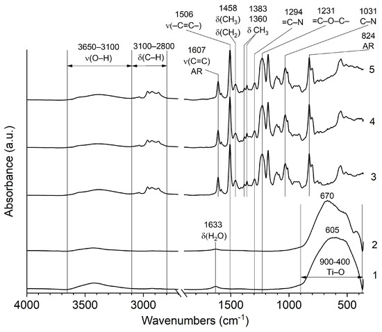 ATR-FTIR spectra: 1—TiO2 (dav = 46 nm); 2—TiO2 (dav = 100 nm); 3—cured epoxy; 4—TiO2/EP of System I (4 wt. % TiO2); and 5—TiO2/EP of System II (4 wt. % TiO2). AR denotes aromatic groups, and =C–N denotes conjugated C–N bonds.