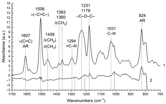 IR spectrum of cured ED-20 (1); difference spectrum obtained as a result of subtraction of the spectrum of the TiO2/EP nanocomposite (3 wt. % TiO2 dav = 46 nm) from the spectrum of the cured ED-20 (2).