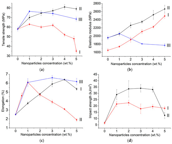 Mechanical properties: tensile strength (a), elasticity modulus (b), and elongation under maximum tension (c); and Charpy impact strength (d). Symbols: I—TiO2/EP of System I (dav = 46 nm), II—TiO2/EP of System II (dav = 100 nm), and III—TiO2/EP of System III (dav = 46 nm + L61).