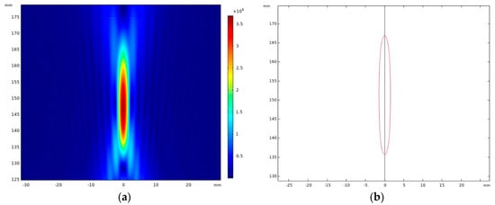 The acoustic field was simulated according to the dimensions of the transducer, and the acoustic pressure distribution and the shape of the AFR were obtained, as shown in Figure 3.