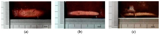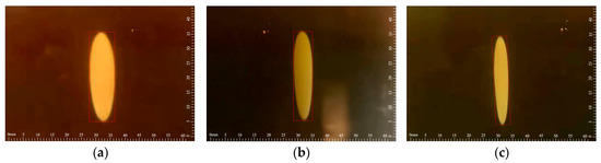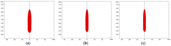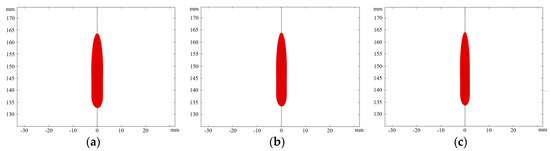 BFRs of phantom after ultrasonication with different combinations of acoustic power and time: (a) 25 W × 449 s, (b) 50 W × 58 s, (c) 75 W × 19 s. It could be seen from Figure 9 that in the phantom experiment, HIFU needed 448 s to induce a BFR with a length of 31.58 mm with an acoustic power of 25 W, and this BFR’s width was 9.17 mm, and the axis length ratio was 3.45, which was far from the axis length ratio of the AFR. The axis length ratio was 5.97 with an acoustic power of 75 W, and the shape of the BFR was closer to that of the AFR, and the exposure energy required was reduced by 87.38%.