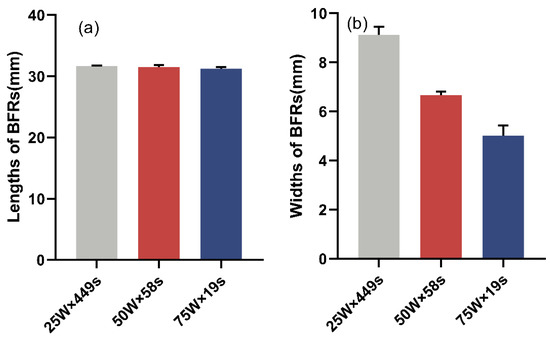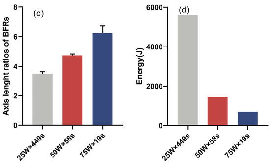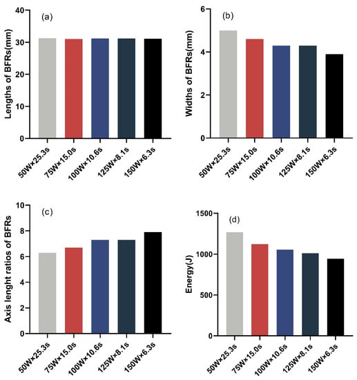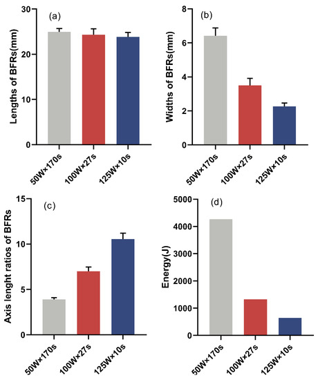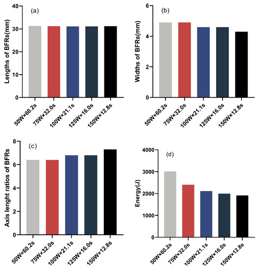The BFRs of bovine liver under different power × time are shown in Figure 10. We counted the exposure time, energy, widths, and axis length ratios of the BFRs when the lengths of the BFRs were approximately equal. These values of the BFRs of three samples in each group were statistically processed as shown in Figure 11.