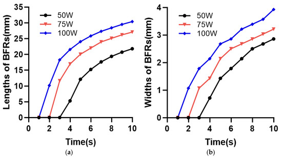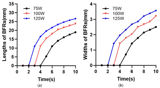 (a) Lengths and (b) widths of the BFRs during ultrasonication with different power in bovine liver.