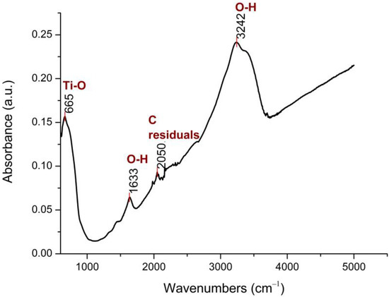 As shown in Figure 1, four major peaks were found, with the two broad bands at 3242 cm−1 and 1633 cm−1 being assigned to the O–H stretching and bending vibrations, respectively. The presence of these hydroxyl groups was due to water that was absorbed on the N-TiO2 NPs’ surface. The vibrational peak at 2050 cm−1 was a result of using organic solvents during the synthesis process and was attributed to C-residuals. The peak at 665 cm−1 was related to the Ti–O stretching mode of Ti–O–Ti bonds [34].
