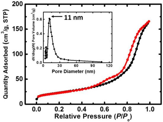 N2-sorption diagram for the N-TiO2 nanoparticles. The black line represents adsorption and the red line represents desorption. The inset shows the pore size distribution as determined by the BJH method.